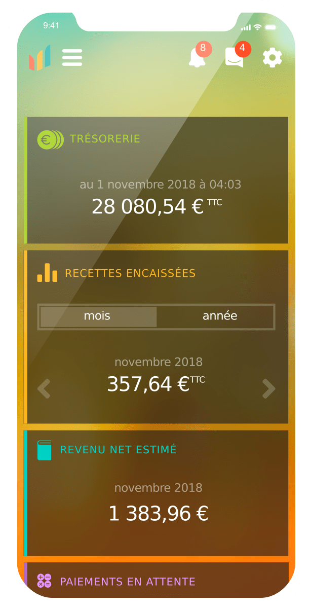 Selon votre activité, Sireniti se charge de vous donner une vision sur votre trésorerie, vos recettes encaissées, votre revenu net estimé/votre chiffre d’affaires, le seuil de votre chiffre d’affaires de l’année, le seuil des charges de l’année et vos cotisations prévisionnelles.