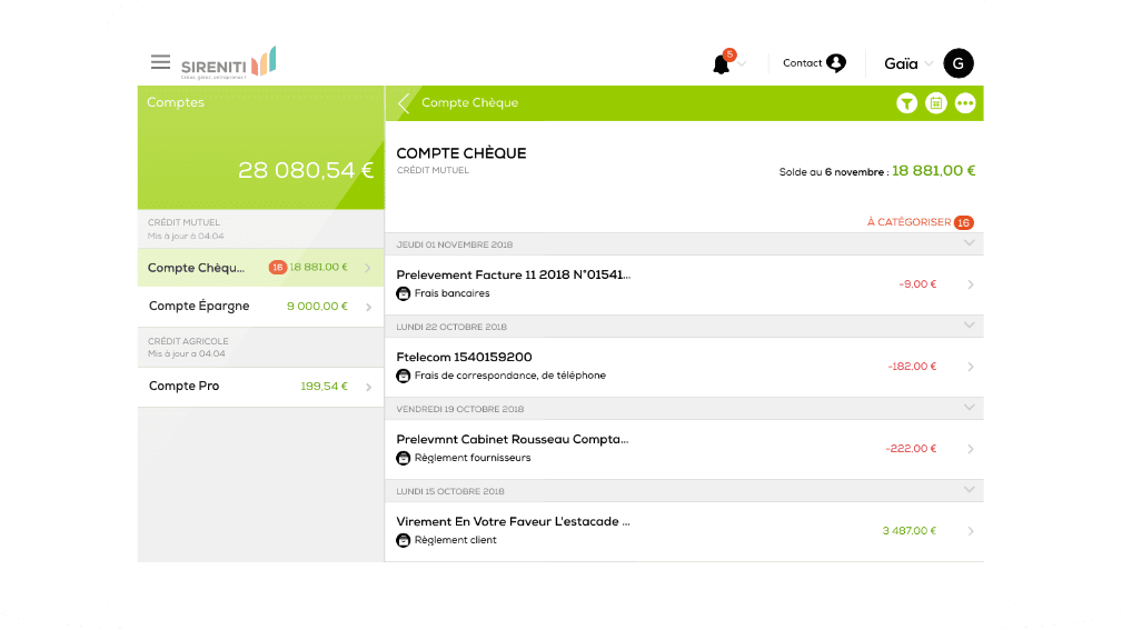 Sireniti récupère vos comptes bancaires pour une gestion quotidienne de votre activité. Vous pouvez ajouter autant de banques que vous le souhaitez. À la première connexion, il vous suffit de catégoriser vos opérations, puis Sireniti s’occupe du reste !